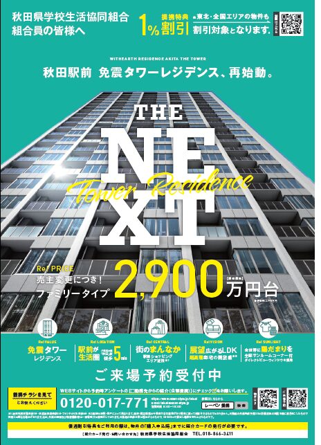 分譲マンション 2025.12.02 分譲マンション来場予約・資料請求受付中ウイザースレジデンス秋田ザ・タワー 組合員の方は割引価格になります!! モデルルームご来場時に組合員証のご提示 または、学校生協へご連絡ください。 チラシ(PDF)