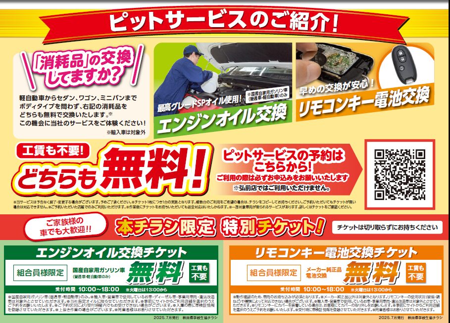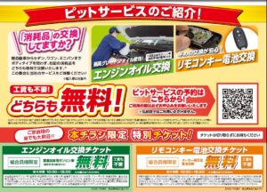 【ネクステージ】からお知らせ 提携店NEWS 2026.02.27 お知らせ 購入・売却のお申し込みはこちらから ピットサービス エンジンオイル交換 リモコンキー電池交換 無料で交換します! ピットサービスのお申し込みはこちらから