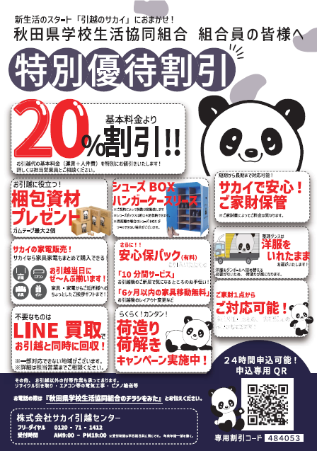 【サカイ引越センター】 提携店NEWS 2026.03.13 特別優待割引 基本料金20%割引 基本料金(運賃+人件費)を特別にお値引!! 割引コード 484053 を入力してください!! お申込はこちらから お電話でのお申し込みはこちらから 「学校生協のチラシをみた」とお伝えください 0120-71-1412